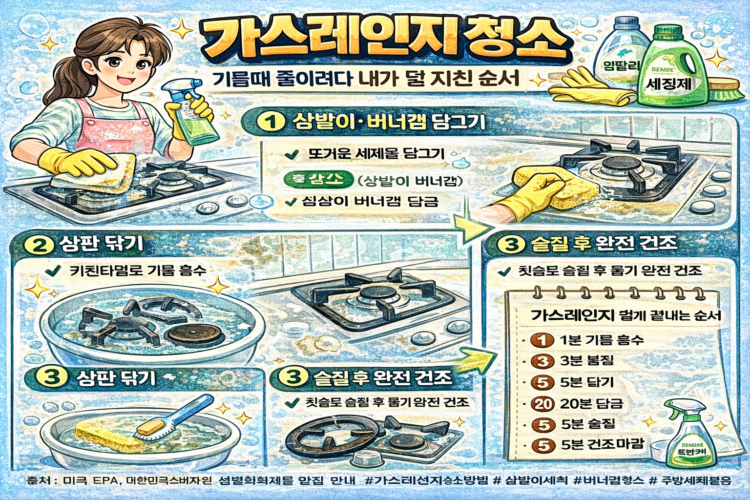 근데 솔직히 기름때는 ‘힘’으로 이기는 게 아니더라고요. 먼저 흡수시키고, 따뜻함으로 풀고, 마지막에 잔여를 깔끔하게 걷어내는 순서가 훨씬 빨랐어요. 기름이 얇을 때는 5분이면 끝나는데, 한 달 미루면 50분이 되는 것도 현실이고요. 오늘은 가스레인지 청소를 한 번에 끝내는 방식으로, 내가 덜 지친 순서만 모아서 정리해둘게요.