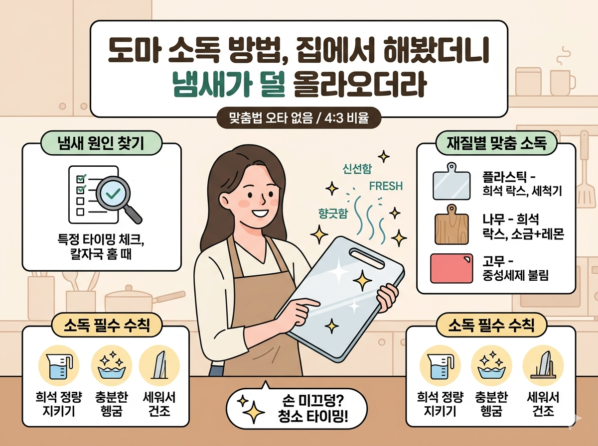 도마는 자주 쓰는 만큼 “내가 계속 할 수 있는 방식”이 중요해요. 그래서 소독을 거창하게 만들지 않는 게 포인트였어요. 뭐, 도마 하나 때문에 주방이 피곤해지면 손이 더 안 가잖아요.