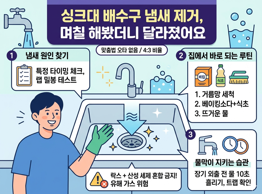 솔직히 주방은 집에서 제일 오래 머무는 동선이라 냄새가 더 크게 느껴져요. 배수구 냄새는 단순 청소로 끝나는 경우도 많지만, 물막이 구조가 깨지면 며칠 만에 다시 올라오죠. 그래서 나는 7일 동안 같은 시간대에 체크하고, 방법을 바꿔가며 기록해봤어요. 이 과정에서 “원인을 먼저 잡으면 돈 0원으로도 잡힌다”는 걸 체감했어요.