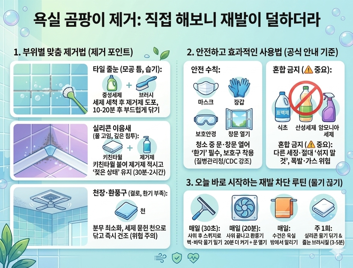 그날 이후로는 원칙을 딱 두 개로 고정했어요. 하나, 섞지 않기. 둘, 욕실 문 열고 환풍 켜기. CDC 2024 안내처럼 표백제는 다른 세정제와 절대 섞지 말라는 경고가 괜히 있는 게 아니더라고요. 솔직히 그날은 “곰팡이보다 내 몸이 먼저”라는 걸 체감했어요. 그래서 곰팡이 제거는 빨리 끝내는 게 아니라, 안전하게 끝내는 게 먼저였어요.