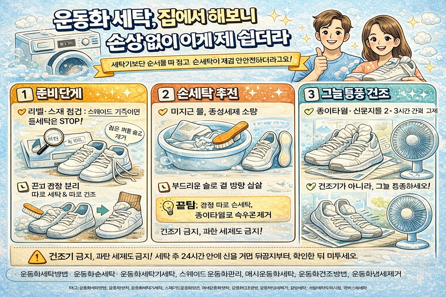 핵심은 손세탁과 그늘 통풍 건조예요. 나이키와 뉴발란스처럼 손세탁을 권하는 공식 안내가 있고, 건조기 열을 피하는 것만으로도 손상 확률이 확 줄어요.
