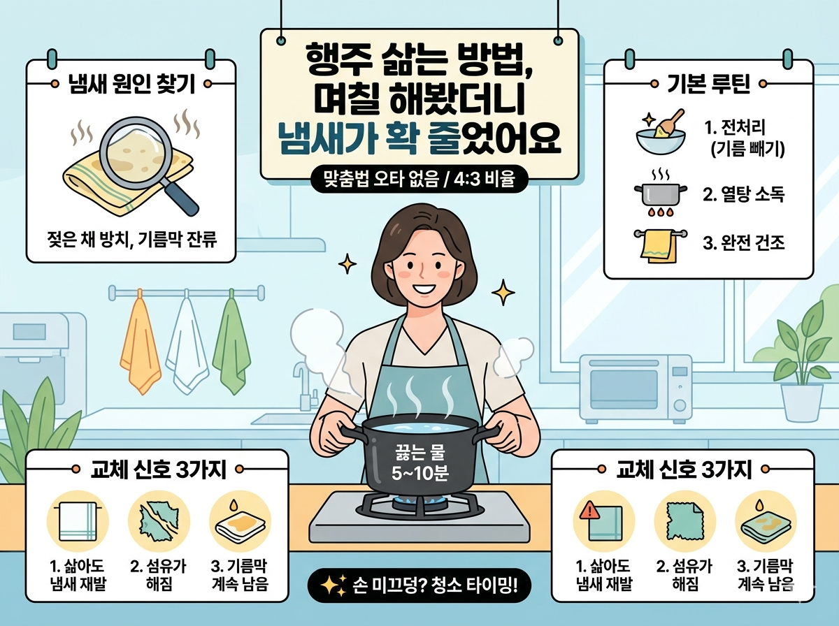 행주를 삶았는데도 냄새가 남는 집이 있어요. 대부분 이유가 비슷해요. 첫째는 삶기 전에 기름을 충분히 빼지 않은 경우예요. 둘째는 삶고 나서도 젖은 채로 방치한 경우예요. 셋째는 행주가 너무 오래돼서 섬유 안쪽에 냄새가 고착된 경우예요. 글쎄, 이 셋 중 하나만 걸려도 “삶았는데 왜 이래”라는 기분이 생기더라고요.